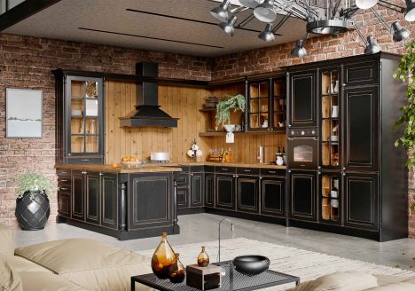 Die klassisch-englische Landhausküche in urbaner Interpretation: CASTEL in Eiche Diva Black. Mattes Tiefschwarz gibt der Patina-Lackierung einen industriellen Look und schafft den spannenden Kontrast zu romantischen Elementen wie Säulen oder Kassettenrahmen.