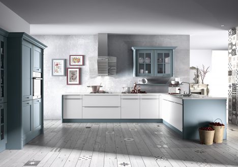 OLDHAM in Eiche Graublau kombiniert Kassettenrahmen mit handwerklich gefertigten Abschlüssen und gedrechselten Zierleisten. Die Oberflächen im PatinaLook unterstreichen den VintageStyle. Perfektes Zusammenspiel: Die Kombination mit schlichten Fronten aus satinato opti Glas in White.